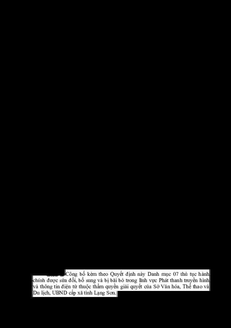 | Tiêu đề văn bản | Quyết định về việc công bố Danh mục thủ tục hành chính được sửa đổi, bổ sung và bị bãi bỏ trong lĩnh vực Phát thanh truyền hình và thông tin điện tử thuộc thẩm quyền giải quyết của Sở Văn hóa, Thể thao và Du lịch, UBND cấp xã tỉnh Lạng Sơn | ||