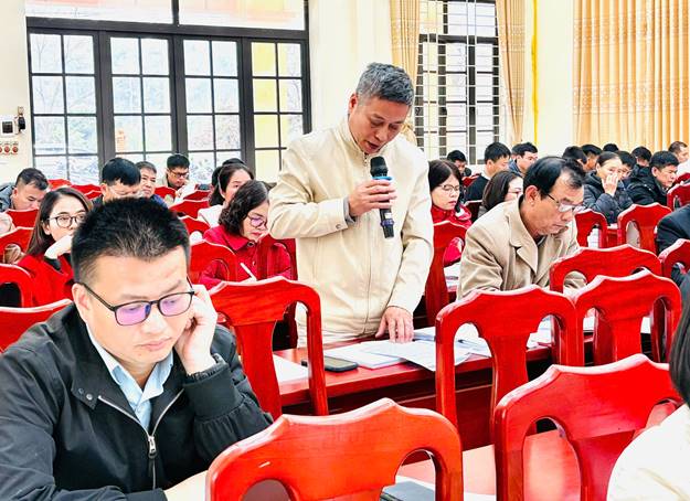 Đồng chí Hứa Văn Cường, Bí thư Đảng ủy, Chủ tịch HĐND xã phát biểu tại hội nghị.