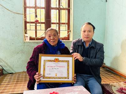 Đồng chí Chu Văn Lợi, Phó Bí thư Thường trực Đảng ủy xã Trao Huy hiệu 60 năm tuổi Đảng tới đảng viên Đào Thị Ninh