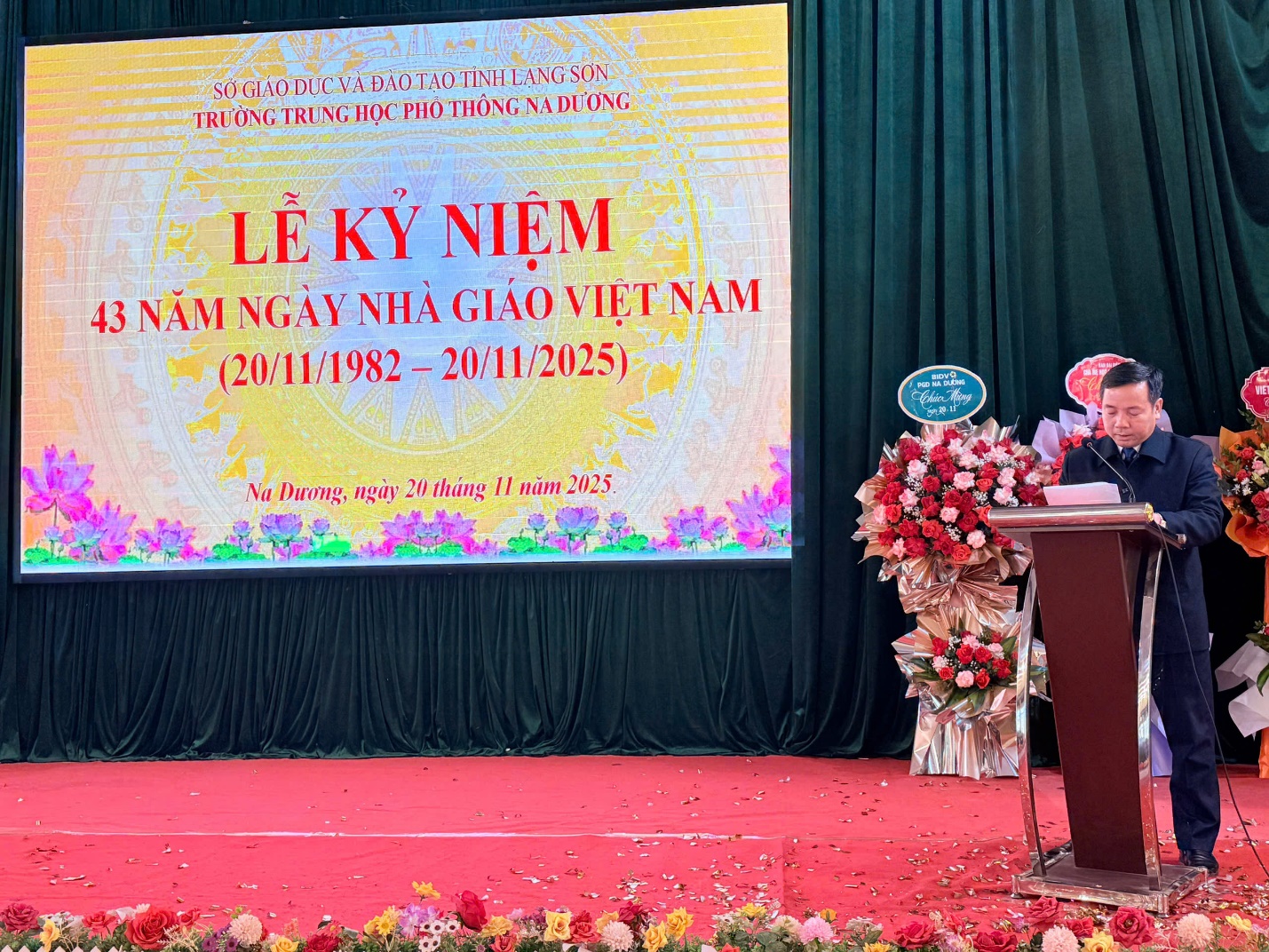 Phát biểu tại buổi lễ, đồng chí Hứa Văn Cường, Bí thư Đảng ủy, Chủ tịch HĐND xã Na Dương biểu dương, ghi nhận những thành tích của thầy và trò Trường Trung học phổ thông Na Dương đã đạt được trong suốt chặng đường qua, đóng góp tích cực vào sự nghiệp Giáo dục và Đào tạo tỉnh Lạng Sơn. Đồng thời, chúc mừng các thầy cô giáo, các em học sinh nhân kỷ niệm 43 năm Ngày Nhà giáo Việt Nam 20/11.