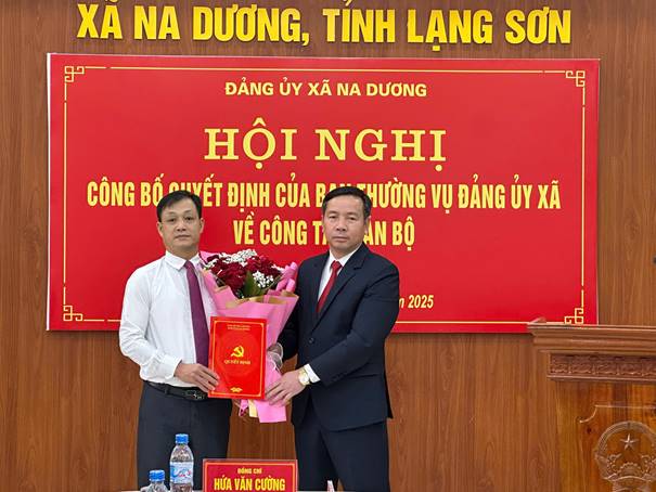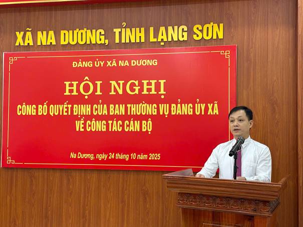 Tại hội nghị, đồng chí Nông Thị Hương, Ủy viên BTV Đảng ủy, Trưởng Ban xây dựng Đảng đảng ủy xã lên công bố Quyết định của Ban Thường vụ Đảng ủy xã về việc tiếp nhận và phân công đồng chí Lộc Văn Hương, Ủy viên Ban Chấp hành Đảng bộ xã giữ chức vụ Chủ tịch Ủy ban Mặt trận Tổ quốc Việt Nam xã Na Dương khóa I, nhiệm kỳ 2025 – 2030 kể từ ngày 22 tháng 10 năm 2025.