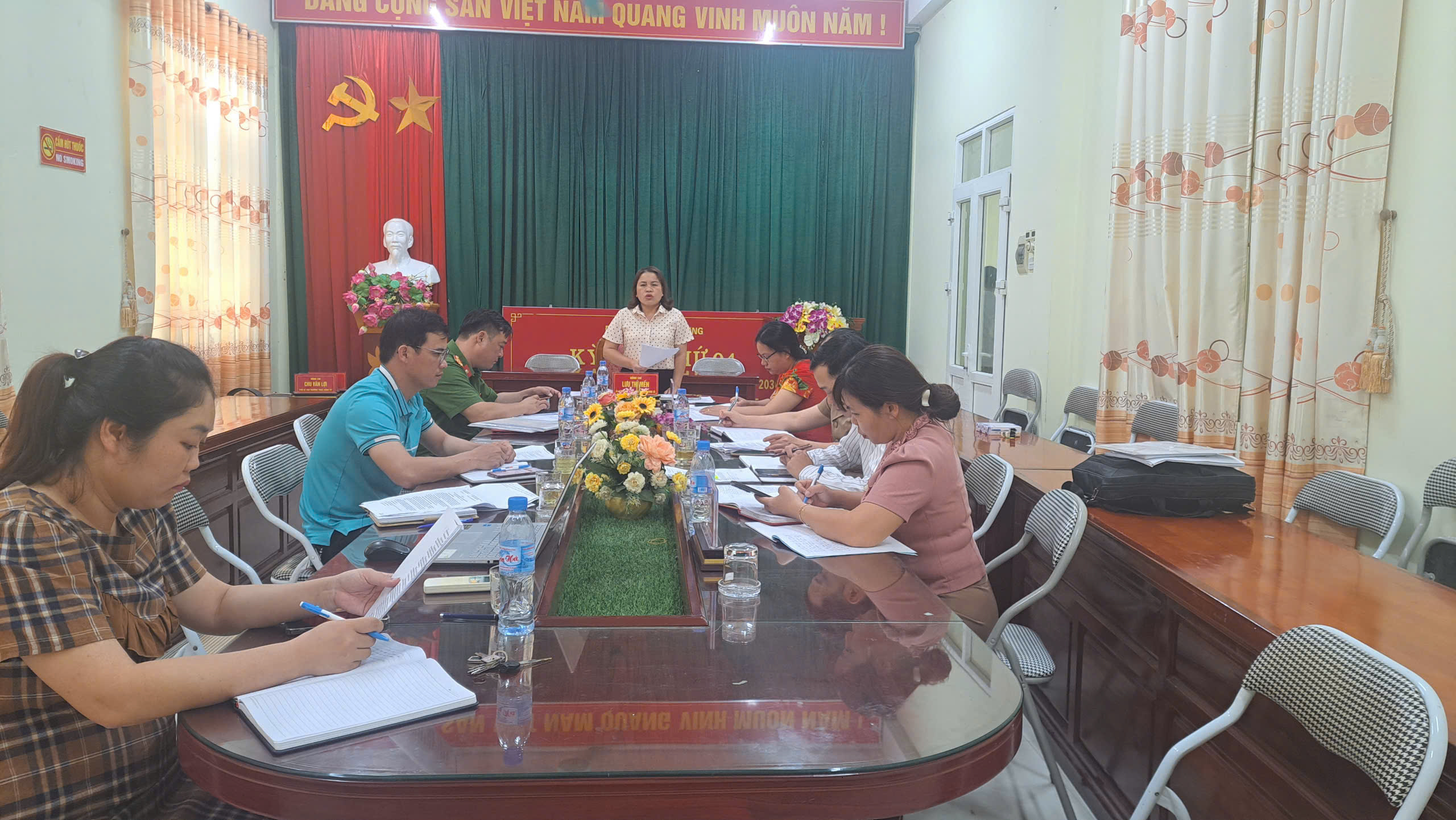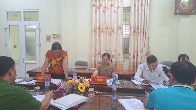 Đoàn kiểm tra do đồng chí Nông Thị Hương - Ủy viên Ban Thường vụ, Trưởng Ban Xây dựng Đảng Đảng ủy xã, kiêm Trưởng Ban Văn hóa – Xã hội HĐND xã - làm Trưởng đoàn. Tham gia Đoàn còn có các đồng chí là thành viên Ban Văn hóa - Xã hội HĐND xã. Đến dự và chỉ đạo buổi kiểm tra có đồng chí Lưu Thị Mến, Ủy viên Ban Thường vụ Đảng ủy, Phó Chủ tịch HĐND xã.