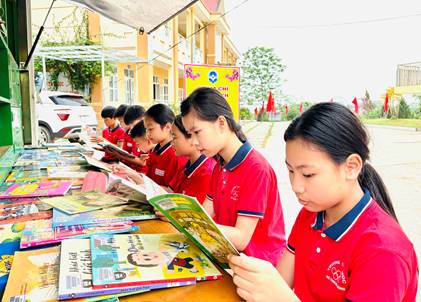 Học sinh đọc sách tại xe thư viện lưu động